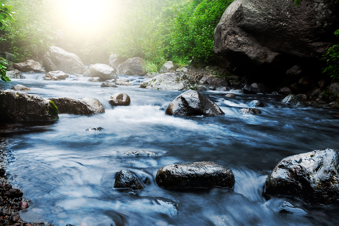 A swift, rocky mountain stream with the sun shining through the green leaves that line the banks.